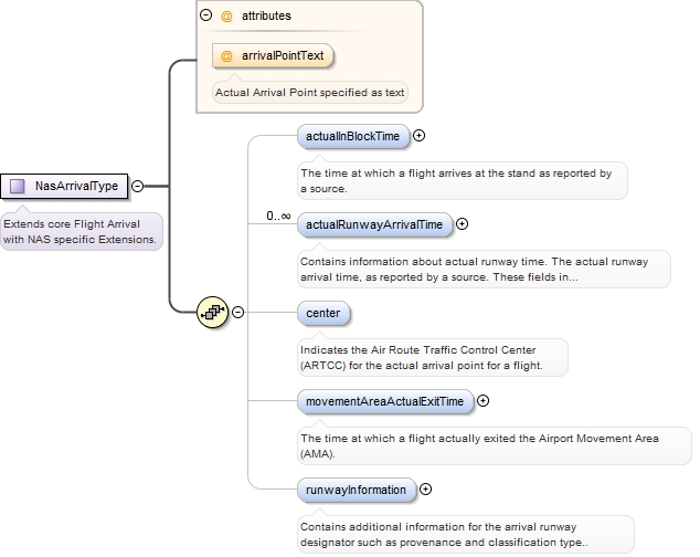 <complexType name="NasArrivalType"><annotation><documentation>Extends core Flight Arrival with NAS specific Extensions.</documentation></annotation><complexContent><extension base="fx:ArrivalType"><sequence><element name="actualInBlockTime" type="nas:ReportedTimeType" minOccurs="0" maxOccurs="1"><annotation><documentation>The time at which a flight arrives at the stand as reported by a source.</documentation></annotation></element><element name="actualRunwayArrivalTime" type="nas:ReportedTimeType" minOccurs="0" maxOccurs="unbounded"><annotation><documentation>Contains information about actual runway time. The actual runway arrival time, as reported by a source. These fields in the U.S. extension are used in order to allow providing provenances source data. Actual arrival time that does not include provenance source data should be recorded in Core.Arrival.actualTimeOfArrival.</documentation></annotation></element><element name="center" type="fb:AtcUnitReferenceType" minOccurs="0" maxOccurs="1"><annotation><documentation>Indicates the Air Route Traffic Control Center (ARTCC) for the actual arrival point for a flight.</documentation></annotation></element><element name="movementAreaActualExitTime" type="nas:ReportedTimeType" minOccurs="0" maxOccurs="1"><annotation><documentation>The time at which a flight actually exited the Airport Movement Area (AMA).</documentation></annotation></element><element name="runwayInformation" type="nas:NasRunwayInformationType" minOccurs="0" maxOccurs="1"><annotation><documentation>Contains additional information for the arrival runway designator such as provenance and classification type..</documentation></annotation></element></sequence><attribute name="arrivalPointText" type="fb:CharacterStringType" use="optional"><annotation><documentation>Actual Arrival Point specified as text</documentation></annotation></attribute></extension></complexContent></complexType>
